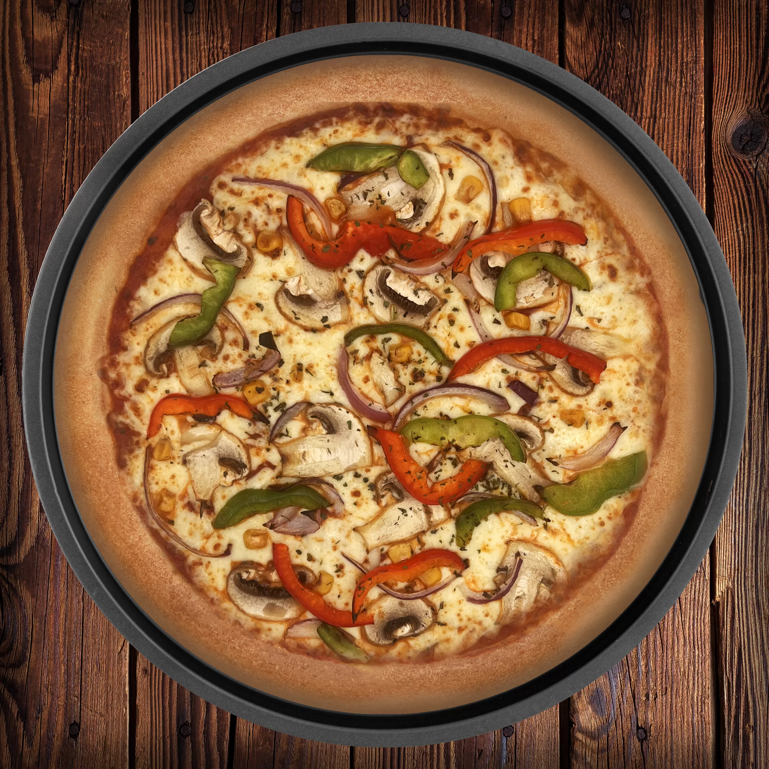 Stone-baked Vegetarian pizza, cooked to order with a crisp base and generous toppings.