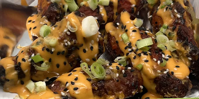 Loaded Triple Cheese Parmo parmo served with creamy béchamel and cheese, finished under the grill and topped with dynamite sauce, garlic sauce and spring onion. Add fries, dips or sides to complete your meal.